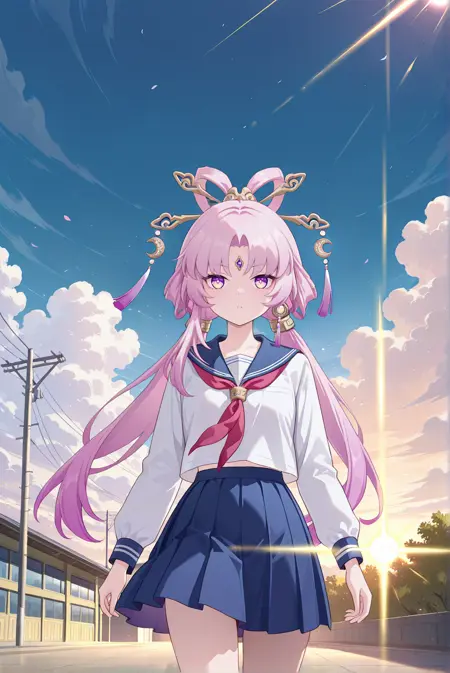 S: f-xuan, 1girl, 분홍색 머리, 보라색 눈, 머리 장식, 머리 고리, 낮은 트윈테일, 이마 보석, 귀걸이, 교복, serafuku, 흰 serafuku, 파란 칼라, 넥커치프, 빨간 넥커치프, 치마, 파란 치마, 주름치마, 긴 소매