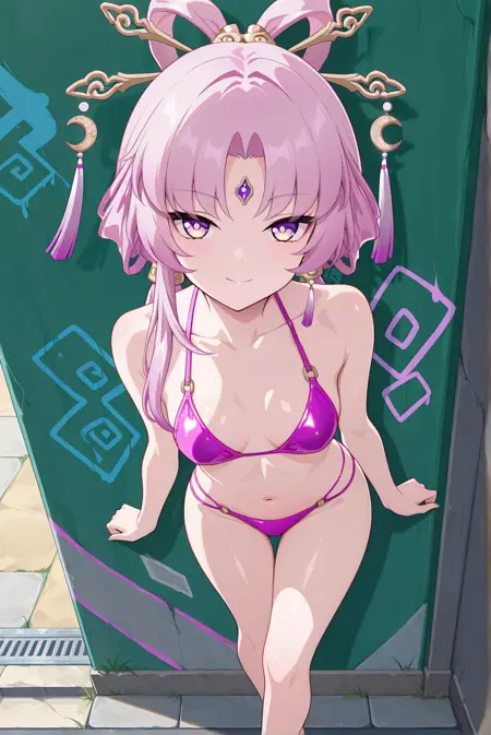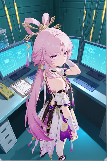 기본: f-xuan, 1girl, 분홍색 머리, 보라색 눈, 머리 장식, 머리 고리, 낮은 트윈테일, 이마 보석, 귀걸이