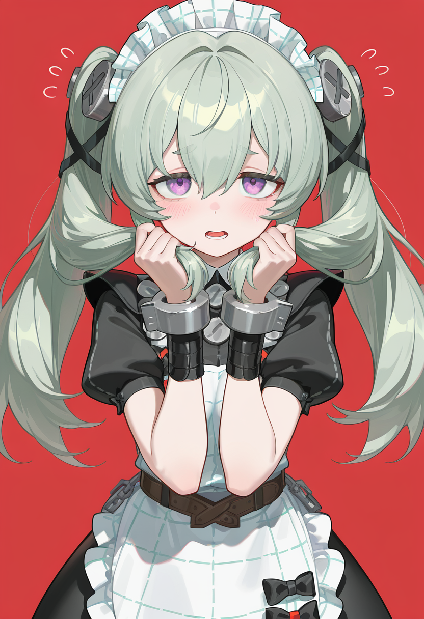 그녀의 옷 태그: dress, short sleeves, frills, puffy sleeves, belt, apron, black dress, puffy short sleeves, maid, maid headdress, chain, white apron, maid apron, cuffs, handcuffs,