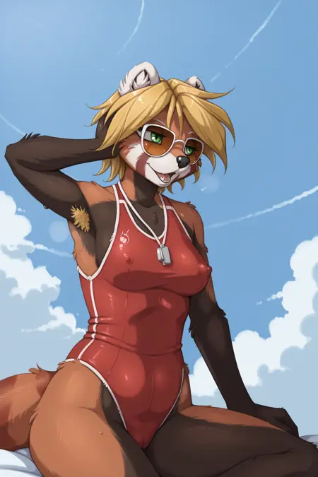 by jay naylor, lynne, furry, furry female, anthro, red panda, ailurid, dark brown fur, red fur, white fur, dark brown body, red body, white body, body fur, multicolored fur, multicolored body, medium breasts, green eyes, blonde hair, tail, striped tail, solo, 1girl, covered erect nipples, sunglasses, animal ears, pubic hair, armpit hair, female pubic hair, snout, short hair, cloud, sky, day, armpits, sitting, animal nose, red one-piece swimsuit, blue sky, looking to side, whistle, upper body