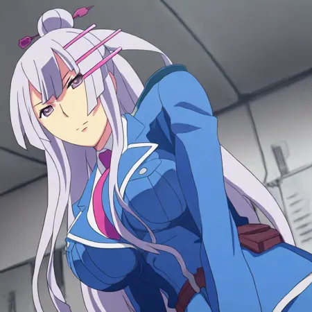 Frolaytia CAPISTRANO, woman, long hair, bangs, hair ornament, purple eyes, white hair, hair bun, single hair bun,big breasts, sexy body,