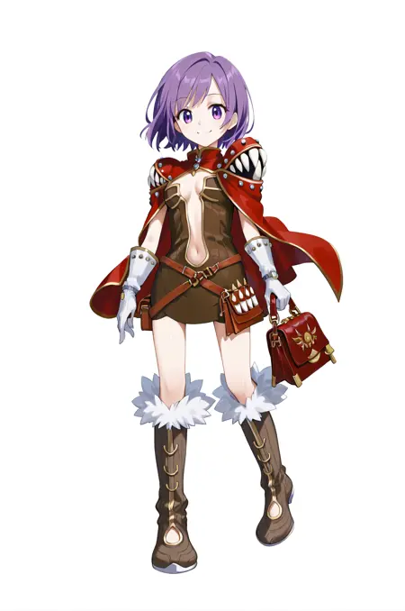 prompt: creatorRo, clothing cutout, center opening, brown belt, strapless dress, brown dress, white gloves, red cape, shoulder armor, living clothes, jewelry, navel, fur trim knee boots