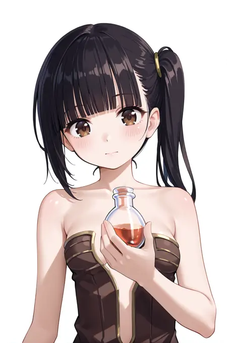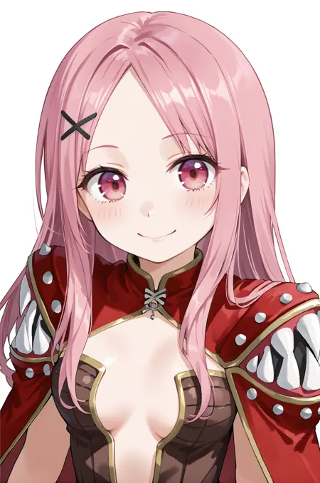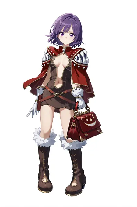 prompt: creatorRo, clothing cutout, center opening, brown belt, strapless dress, brown dress, white gloves, red cape, shoulder armor, living clothes, jewelry, navel, fur trim knee boots