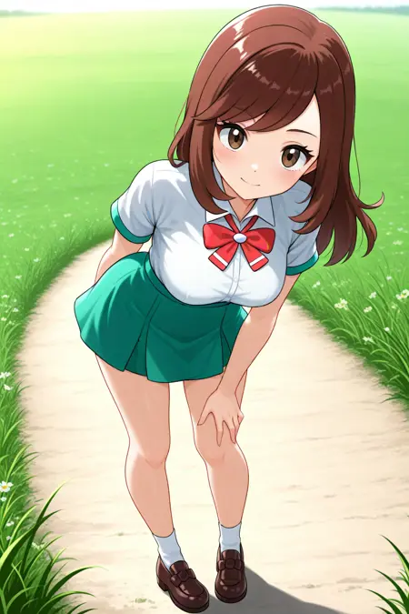lasslgpe, lass \(pokemon lgpe\), brown eyes, brown hair, long hair, bangs, white shirt, collared shirt, short sleeves, red bowtie, green skirt, pleated skirt, miniskirt, white socks, ankle socks, loafers, brown footwear