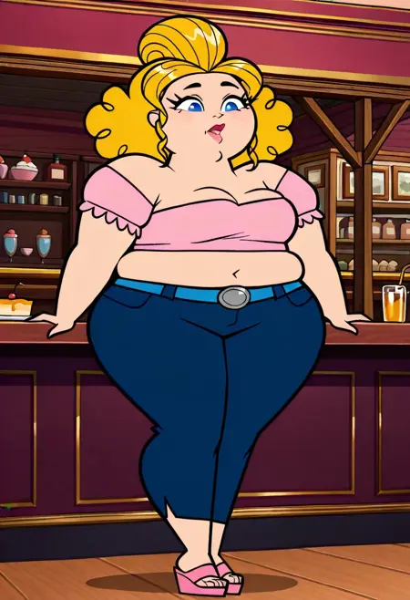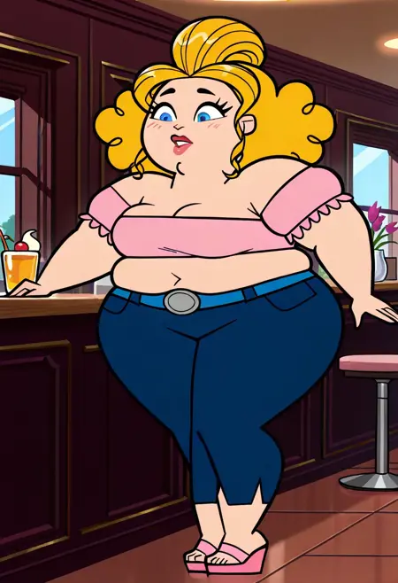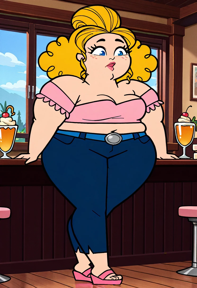 SugarTDPI, 1girl, tall, chubby, light skin, cherry lips, lipstick, cornflower blue eyes, honey blonde curly hair with a large puf, pink top. indigo blue jeans, azure blue belt, pink wedge sandals, thicc thighs, wide hips, fat,