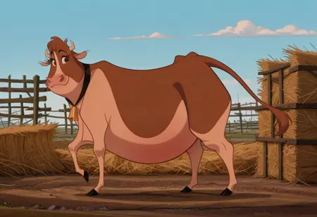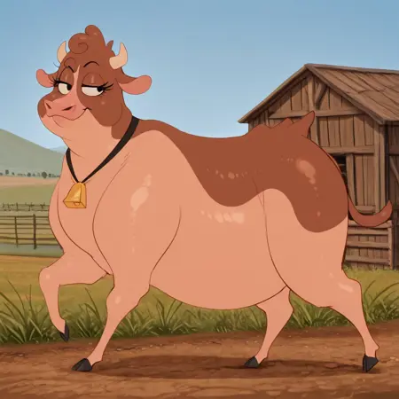 m4gg13, female, cow, cartoon style, disney style, brown fur, light brown fur, medium horns, cowbell, black hooves, curvy body, sarcastic smile, droopy eyelids, farm setting, walking, side view, front view, animated shading
