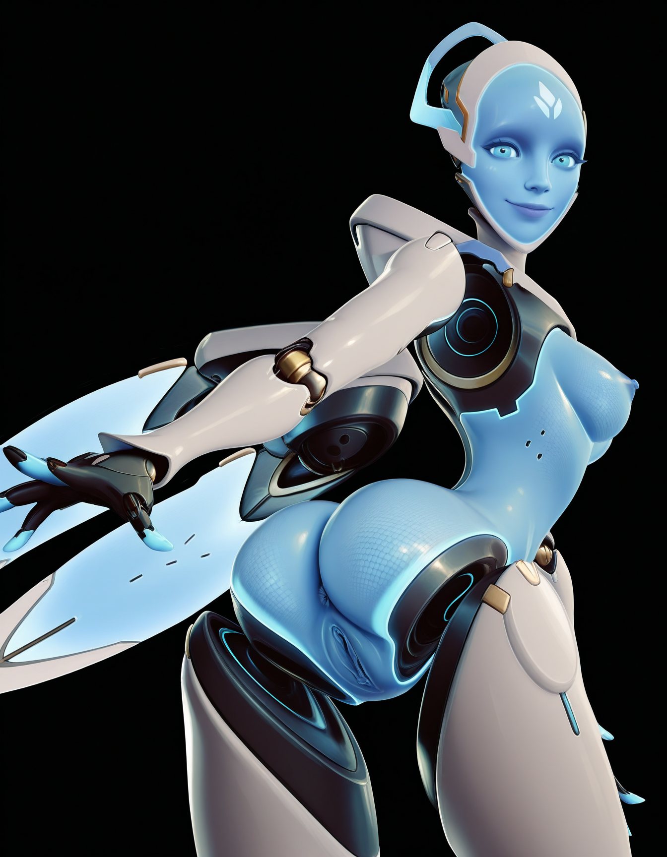 xechox, blue skin, humanoid robot, overwatch, robot joints, detached wings