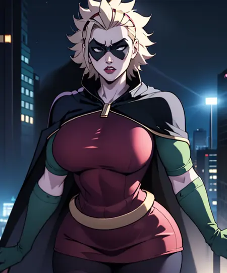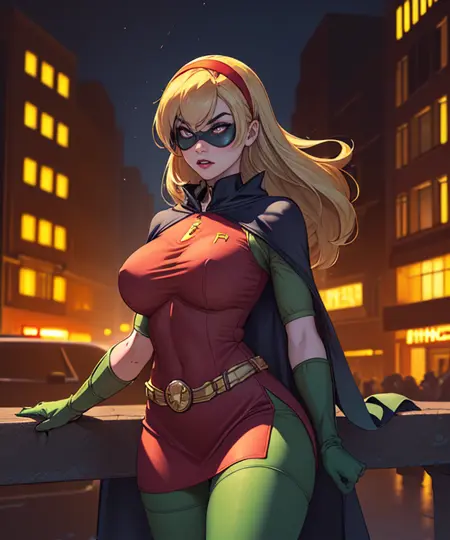 服装:robin,superhero,red_minidress,green_sleeves,black_cape,short_sleeves,green_gloves,letter_"R"logo,breast_logo,letter"R"_icon,breast_icon,R_breast_emblem,green_pantyhose,gold_belt,red_skirt,bare_elbows,gold_clasps,