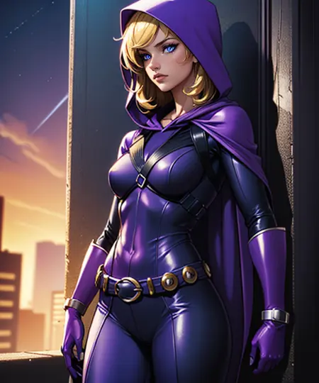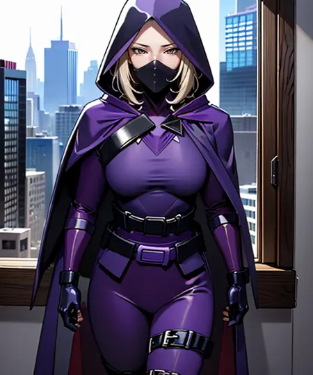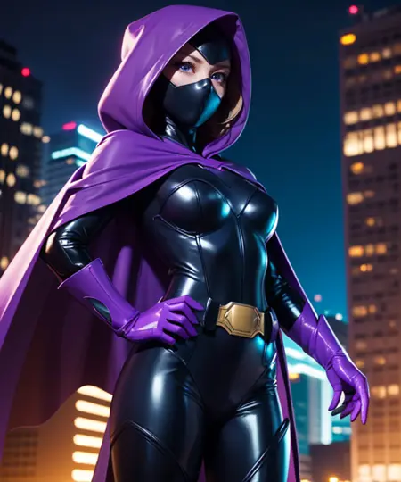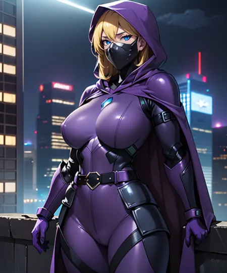现代装甲服装:SpoilerArmoredBlack, black_and_purple_bodysuit, purple_cape, armored_bodysuit, purple_armor, purple_belt, purple_gloves, purple_bracers, superhero,