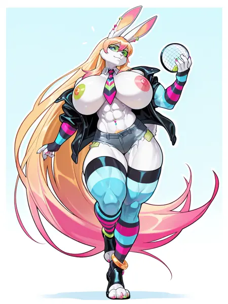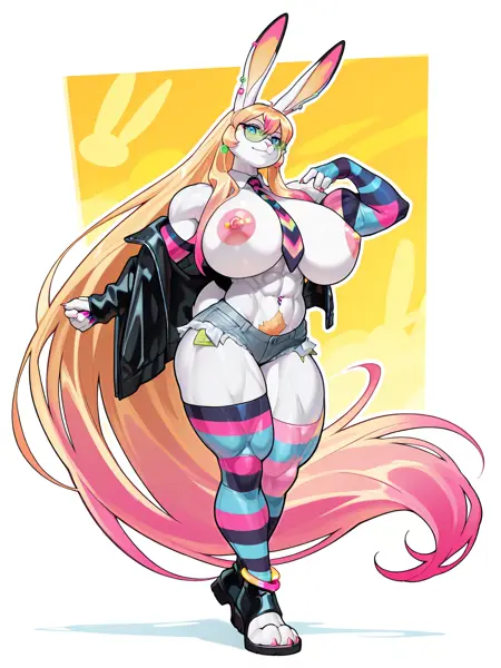 - lullypopbny, 페리, 안트로, 안트로 래비, 안트로 토끼, ((하얀 피부 여성)), 젖꼭지, 동물 귀, 토끼 귀, 긴 머리, 금발 머리, 음모, 여성 음모, 매우 긴 머리, 복근, 꼬리, 분홍색 머리, 다색 머리, 배꼽, 토끼 꼬리, 피어싱, 전신, 네일 폴리시, 벌거벗은, 발톱 네일 폴리시, 그라데이션 머리, 배꼽 피어싱, 근육질, 발가락, 파란 눈, 발톱, 근육질 여성, 헤어, 파란 눈, 금발 머리에 분홍색 끝, 매우 긴 머리, 흰 털, 거대한 가슴, 복근, 근육질, 키가 큰 몸, 발, 녹색 및 분홍색 귀걸이, 녹색 선글라스, 다색 줄무늬 넥타이, 검정 재킷, 다색 젖꼭지 패치, 피시넷 탱크톱, 드러난 가슴, 청바지 반바지, 한쪽 팔에 다색 줄무늬 팔 장갑, 한쪽 팔에 파란 팔 장갑, 왼쪽 다리에 다색 줄무늬 양말, 한쪽 다리에 파란 양말, 한쪽 다리에 앵클릿, 검정 하이힐 신발