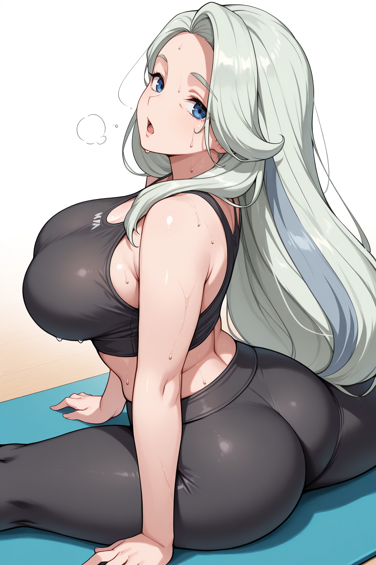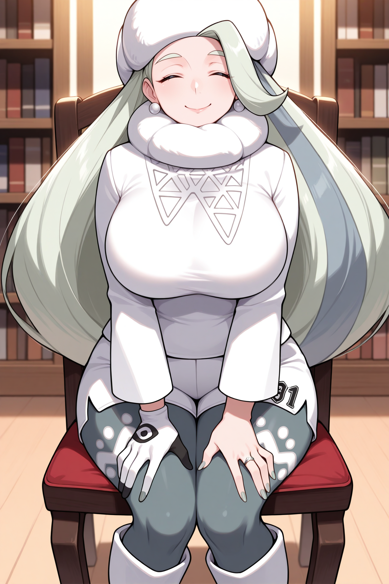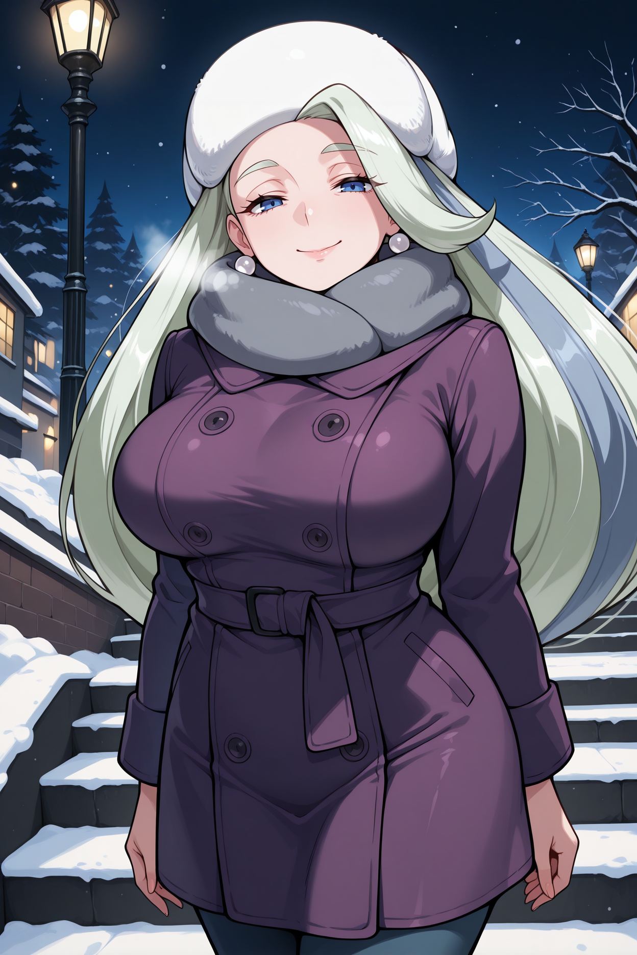 그녀의 전형적인 외모를 표현하려면 "모피 모자, 흰색 머리장식, 진주 귀걸이, 흰색 목 베개, 흰색 스웨터, 흰색 반바지, 한쪽 장갑, 회색 레깅스, 프린트 레깅스, 흰색 부츠, 결혼 반지"를 추가하세요.