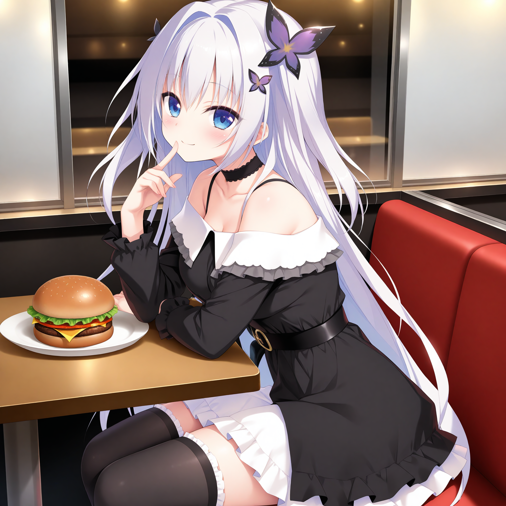 일반 드레스, 검은 드레스, 프릴 드레스, 긴 소매, 벨트, 검은 초커, 끝목뼈, 어깨 드레스, 어깨 드레스, 벌어진 어깨, 검은 허벅지 양말, 흰색 프릴, 흰색 스커트,