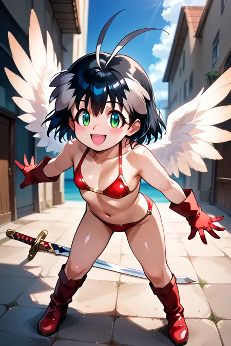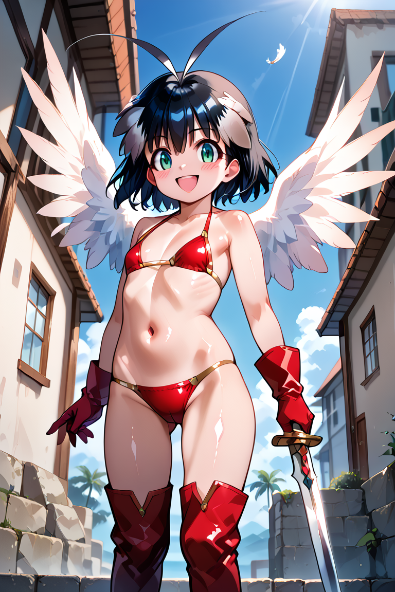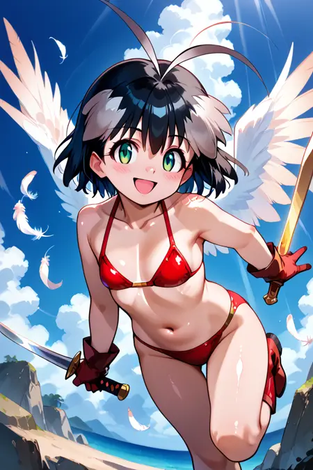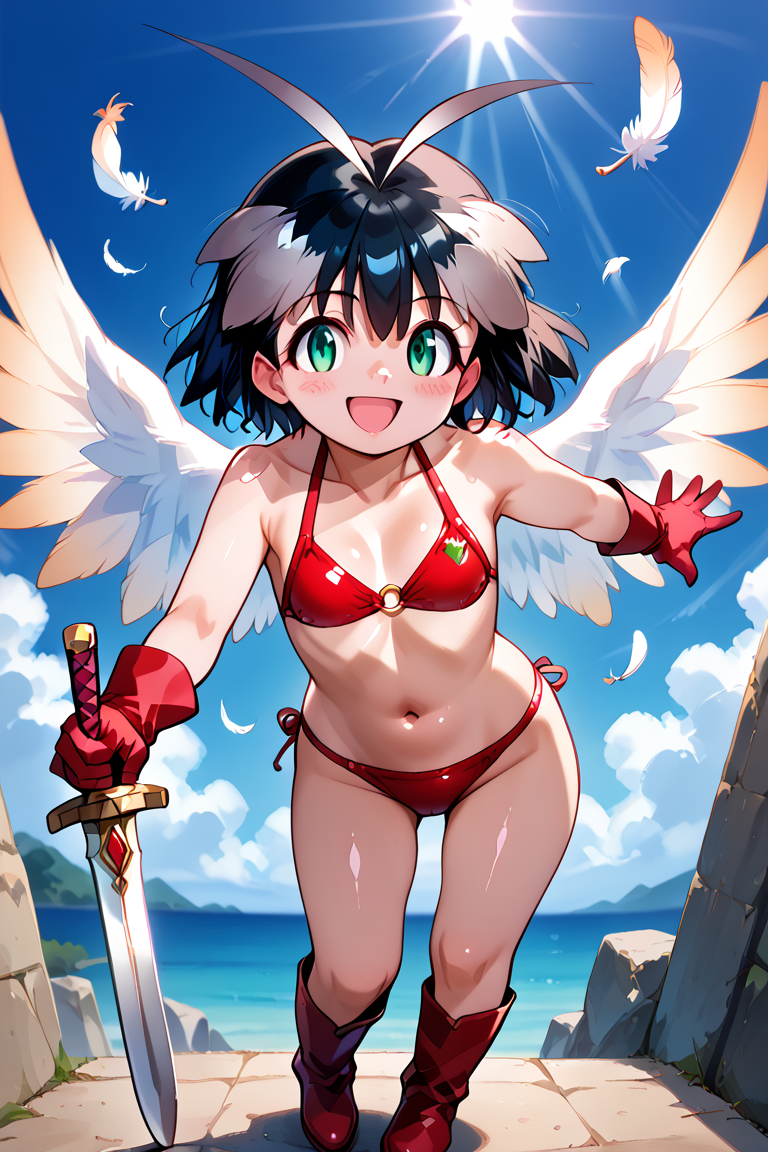 fubuki, 1girl, 单人, 看着观众, 短发, 黑发, 手套, 肚脐, 持有, 泳装, 全身, 武器, 比基尼, 小乳房, 靴子, 翅膀, 剑, 持有武器, 持有剑, 天线发, 羽毛, 红色比基尼,