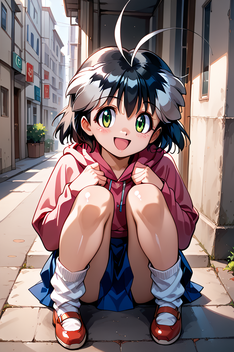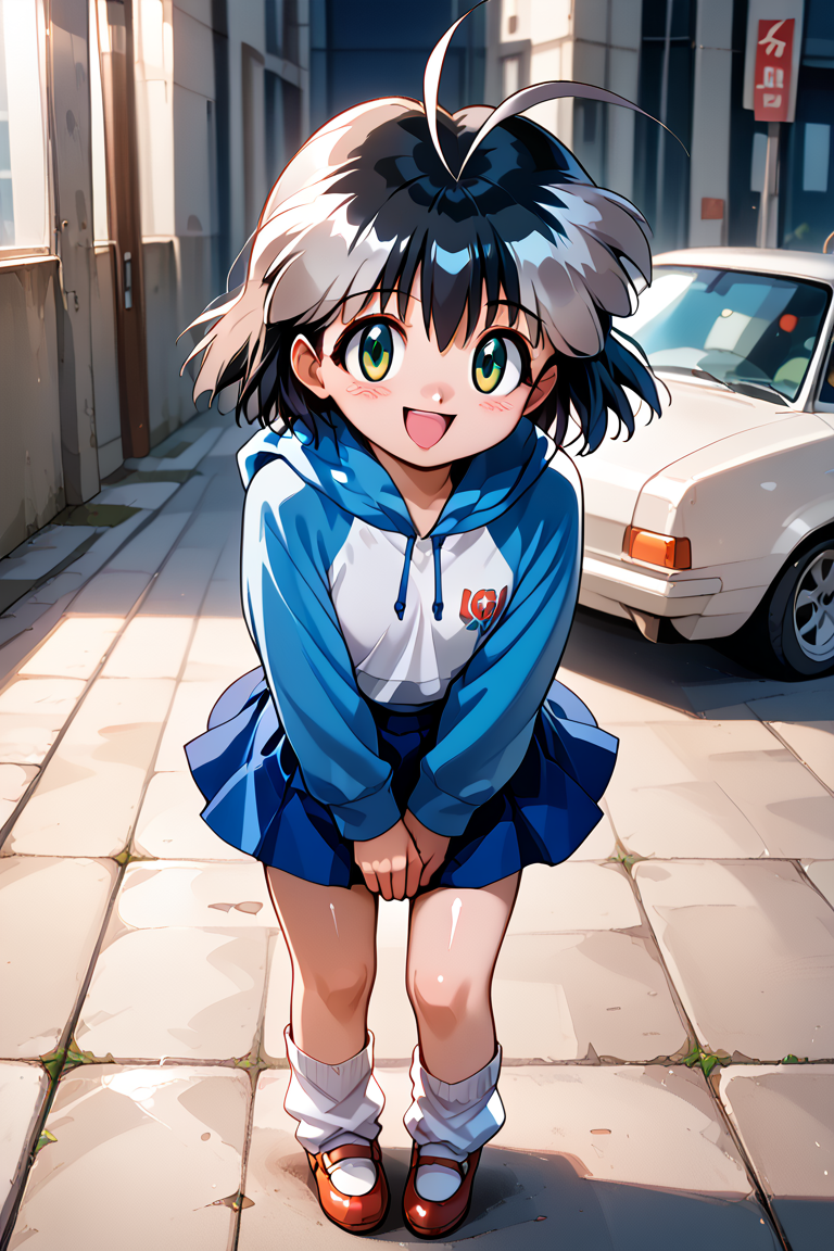 fubuki, 1girl, 单人, 看着观众, 短发, 裙子, 黑发, 长袖, 绿眼, 全身, 白发, 灰发, 鞋子, 袜子, 连帽衫, 蓝色裙子, 连帽衫, 帽子放下, 天线发, 白袜, 松垮袜子, 多色发,