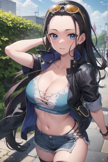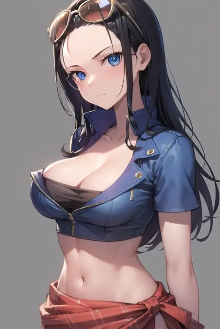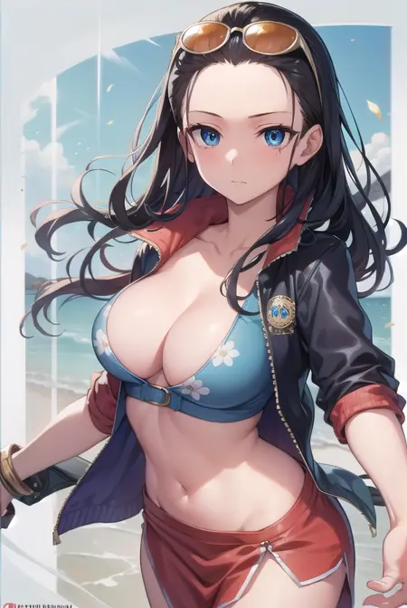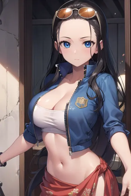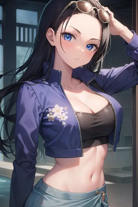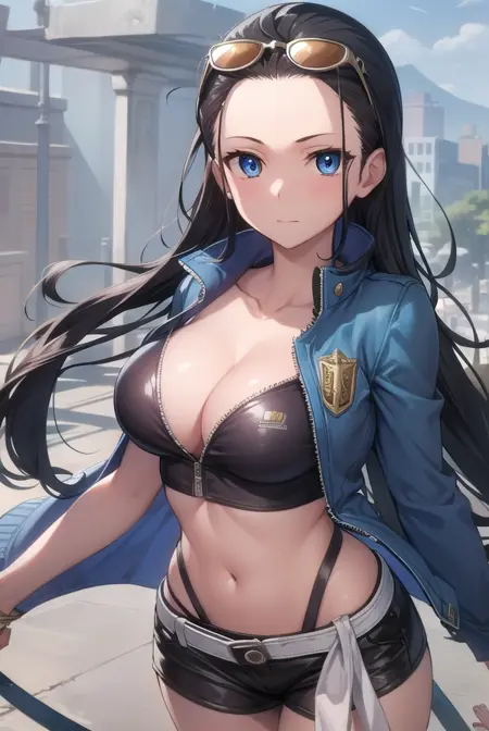 nico robin, black hair, blue eyes, hair slicked back, long hair,