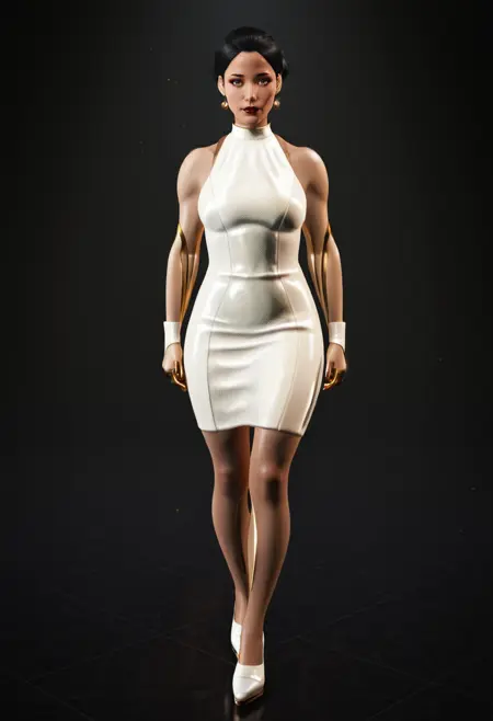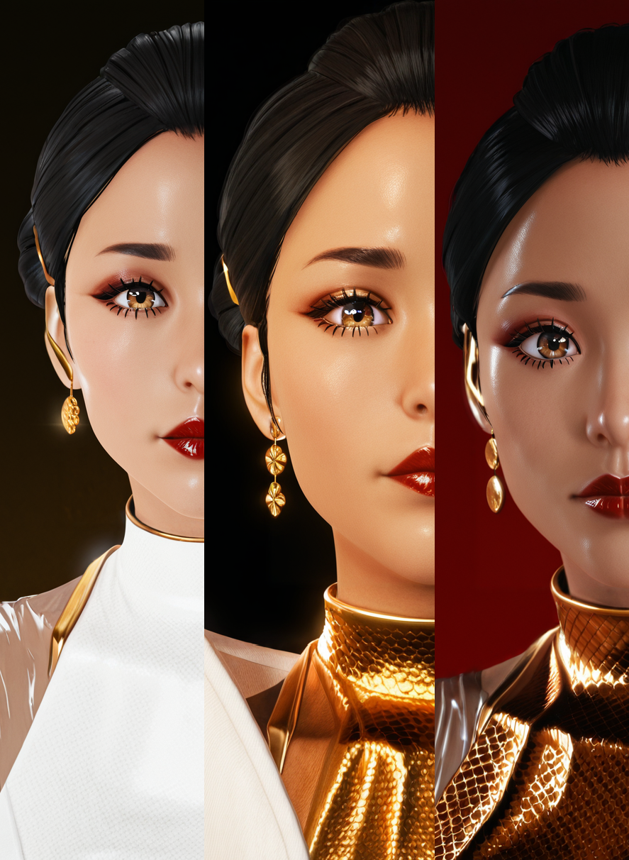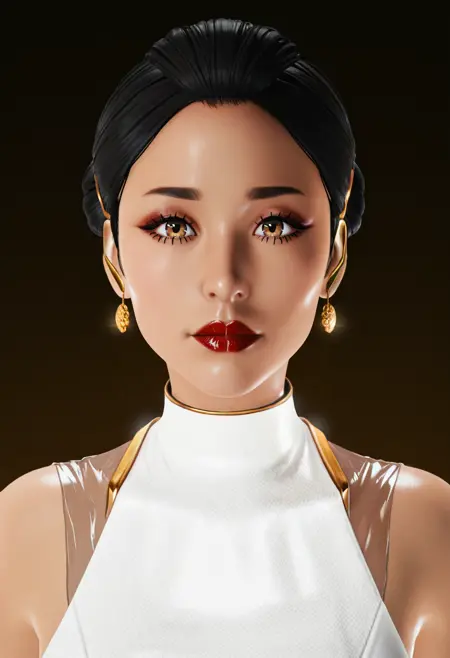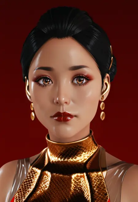 若想保留她的外观,请添加:gold_fingers, brown_eyes, golden_ringed_iris, detailed_eyes, low bun hairstyles, black hair, bordeaux_lipstick
