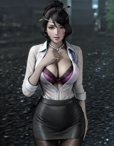 最佳画质照片,1girl,lora:Nagi\_Toukiden:1,Nagi_Toukiden,短黑发,大胸,嘴唇,项链,棕眼,(办公室女郎,白衬衫,开衩铅笔裙,透视,乳沟,美丽胸部 :1.25),(丝袜,内裤,性感女性,高品质内衣 :1.35),(胸衣,敞开的衬衫)