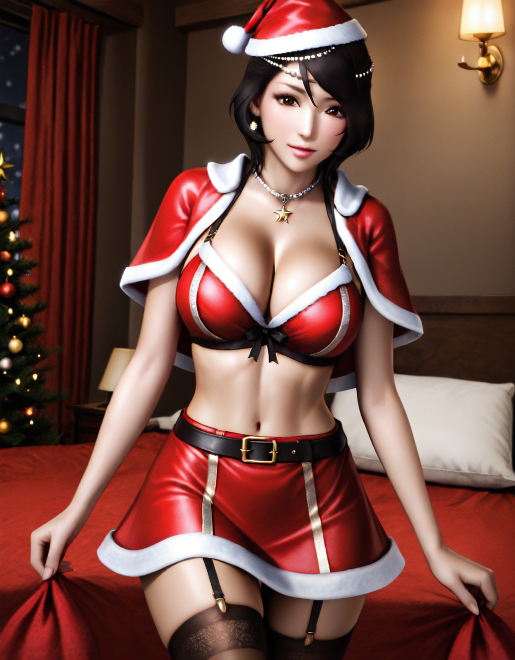 짧은 검은 머리, 큰 가슴, 입술, 목걸이, 갈색 눈