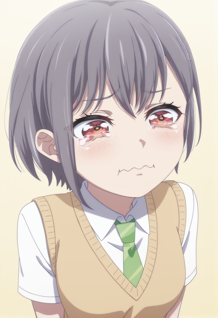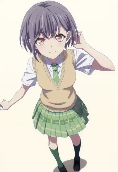 <lora:Takamatsu TomoriV1-Nuclear1811-IL>,Takamatsu Tomori,red eyes,short hair,grey hair,bangs,ch2,ch2 school uniform,ch2 necktie,ch2 green necktie,ch2 striped necktie,ch2 shirt,ch2 white shirt,ch2 collared shirt,ch2 short sleeves,ch2 sweater vest,ch2 yellow sweater vest,ch2 skirt,green skirt,ch2 pleated skirt,ch2 plaid,ch2 plaid skirt,ch2 socks,ch2 kneehighs,ch2 green socks,ch2 shoes,ch2 black footwear,ch2 loafers,