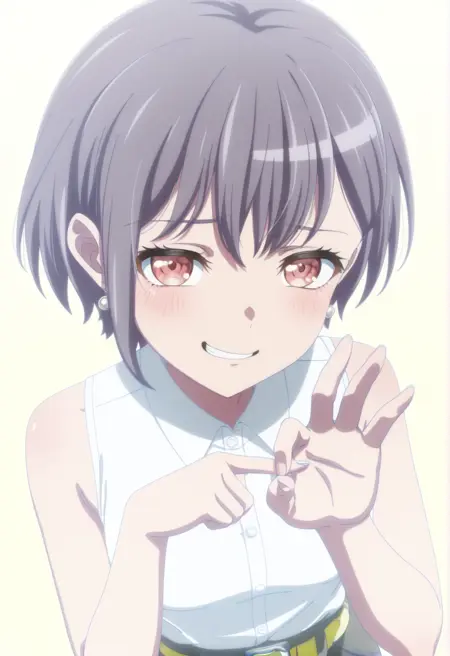 <lora:Takamatsu TomoriV1-Nuclear1811-IL>,Takamatsu Tomori,red eyes,short hair,grey hair,bangs,ch4,ch4 jewelry,ch4 earrings,ch4 shirt,ch4 white shirt,ch4 collared shirt,ch4 sleeveless,ch4 sleeveless shirt,ch4 shirt tucked in,ch4 bare shoulders,ch4 belt,ch4 yellow belt,ch4 belt buckle,ch4 skirt,ch4 pencil_skirt,ch4 grey pencil skirt,ch4 socks,ch4 black socks,ch4 shoes,ch4 white footwear,ch4 sneakers,