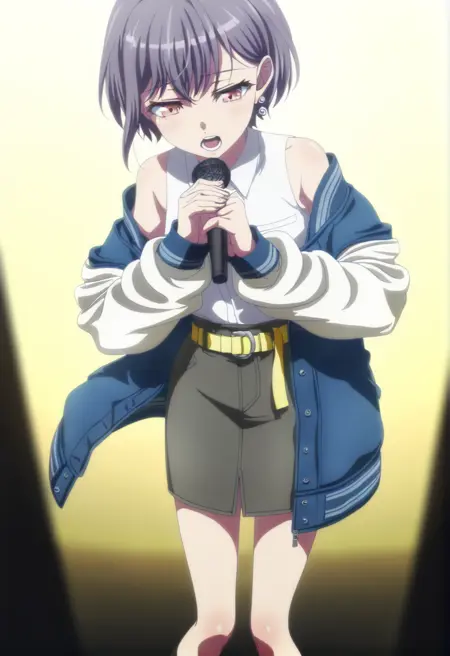 <lora:Takamatsu TomoriV1-Nuclear1811-IL>,Takamatsu Tomori,red eyes,short hair,grey hair,bangs,ch4,ch4 jewelry,ch4 earrings,ch4 shirt,ch4 white shirt,ch4 collared shirt,ch4 sleeveless,ch4 sleeveless shirt,ch4 shirt tucked in,ch4 jacket,ch4 open clothes,ch4 open jacket,ch4 long sleeves,ch4 belt,ch4 yellow belt,ch4 belt buckle,ch4 skirt,ch4 pencil_skirt,ch4 grey pencil skirt,ch4 socks,ch4 black socks,ch4 shoes,ch4 white footwear,ch4 sneakers,