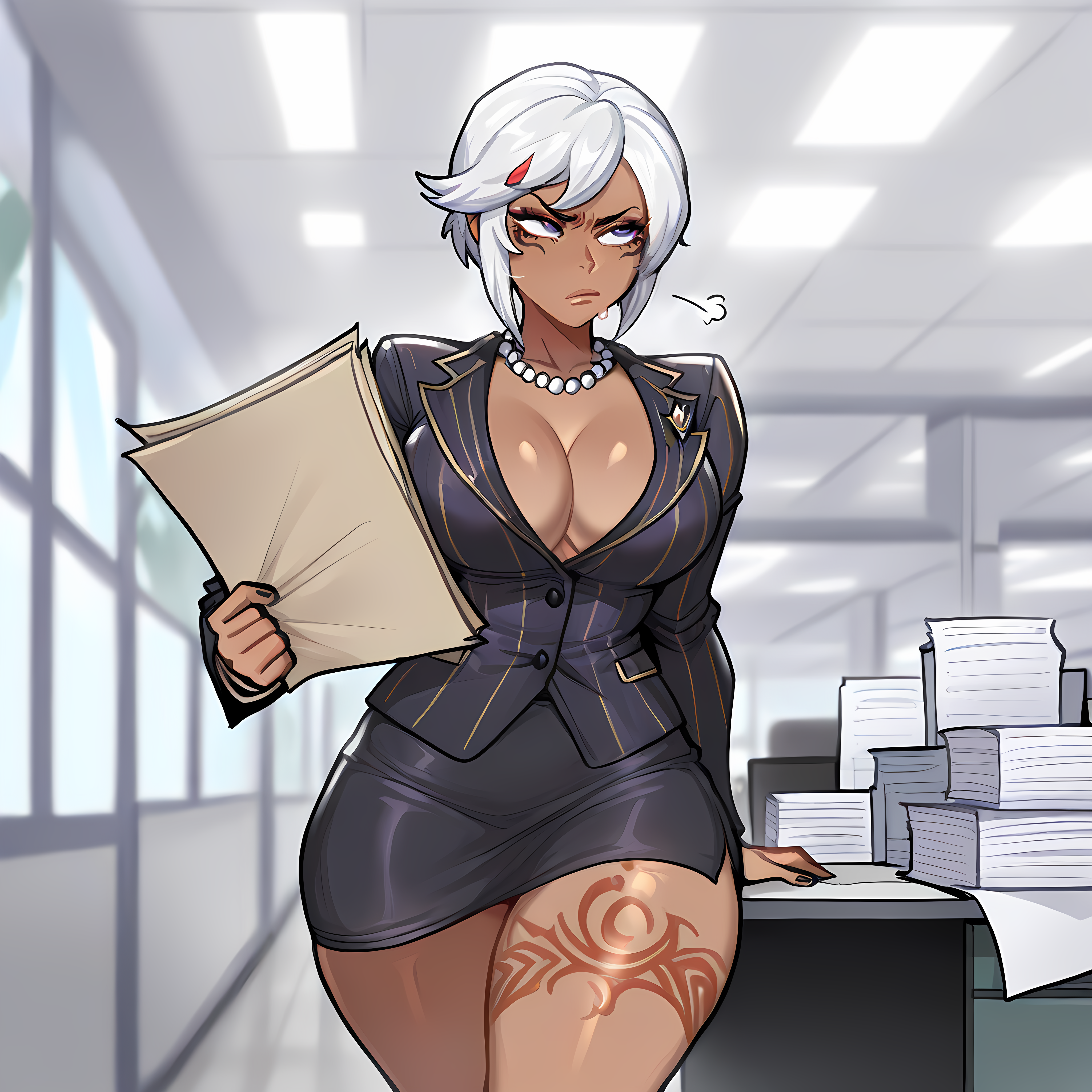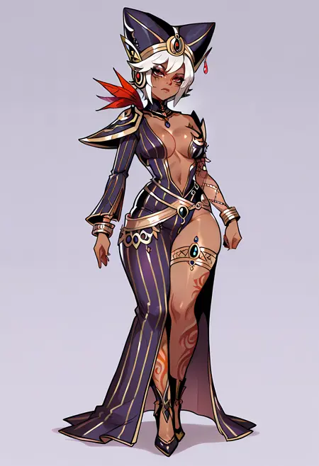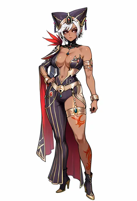 추가: 흰색 머리카락, 짧은 머리, 붉은 눈, 검은 피부, 검은 피부를 가진 여자, 마스크, 모자, 드레스, 비대칭 옷, 중앙 열림, 젖가슴, 하이힐, 보석, 팔찌, 지팡이, 다리 문신