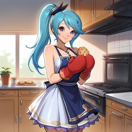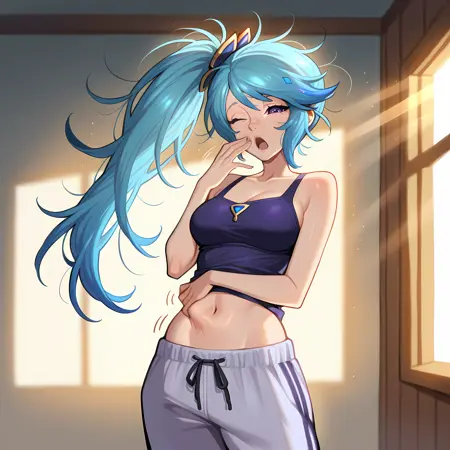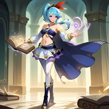 추가: 파란 머리카락, 긴 머리카락, 옆머리 페이스, 보라색 눈, 파란 밴도 상의, 치마, 분리된 소매, 드러난 어깨, 배꼽, 복부, 망토, 흰색 팬티스타킹, 부츠, 깃털, 머리 장신구, 보석, 목걸이, 팔찌