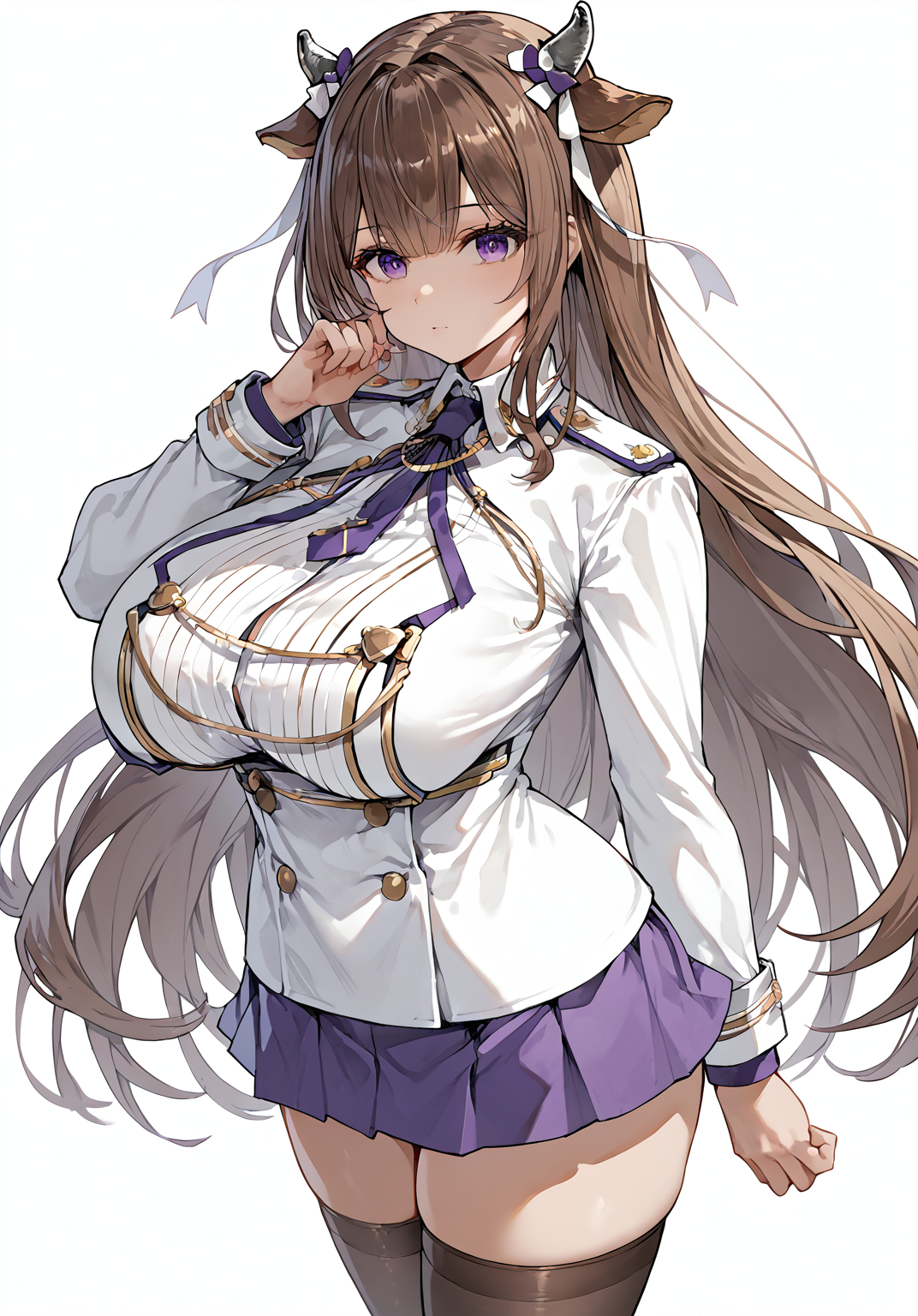原版(original):kashino \(azur_lane\),brown hair,cow_ears, cow_horns, purple eyes,long hair, military uniform, skirt, thighhighs,