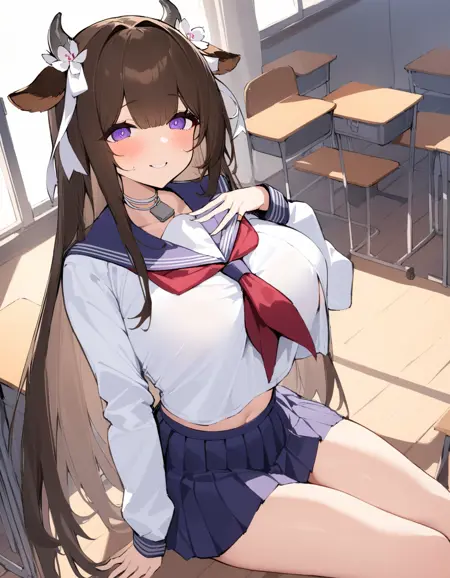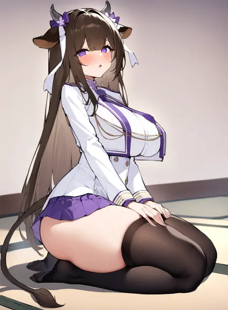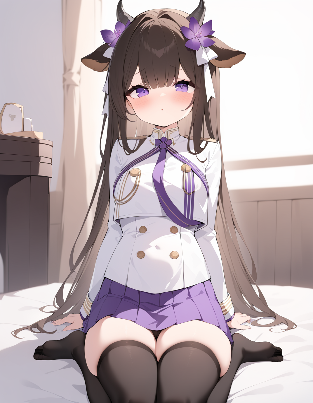 원본(original): kashino (azur_lane), 갈색 머리, 소 귀, 소 뿔, 보라색 눈, 긴 머리, 군복, 치마, 허벅지 스타킹,