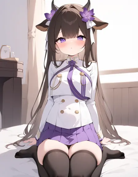 原版(original):kashino \(azur_lane\),brown hair,cow_ears, cow_horns, purple eyes,long hair, military uniform, skirt, thighhighs,