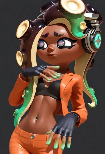 사이드 오더 복장: marina_(splatoon), 주황색 재킷, 정장, 긴 소매, 주황색 바지, 짙은 파란색 머리, 짙은 머리, 헤드폰, 허리 부분, 검은 피부, 검은 피부 여성, 크롭 탑, 손가락 없는 장갑, 색깔 있는 피부, 검은 브라, 배꼽 피어싱, 다색 피부, 흡착판, 옥토리안, 분홍색 동공, 두족류 눈, 파란색 손가락