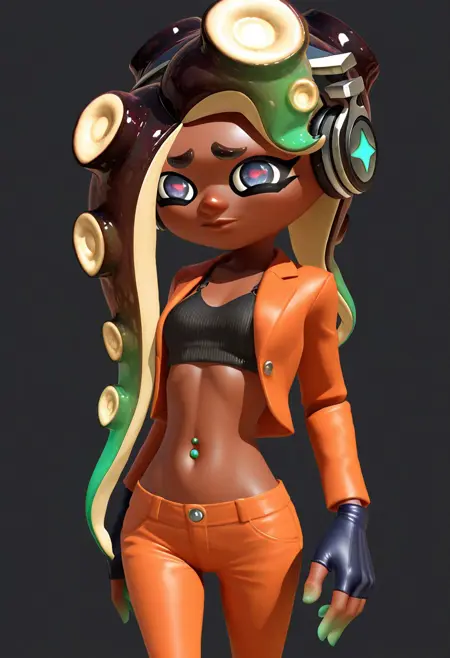 サイドオーダー衣装: marina_(splatoon)、オレンジ色のジャケット、スーツ、長袖、オレンジ色のパンツ、濃い青髪、濃い髪、ヘッドホン、腹部、暗い肌、暗い肌の女性、カーポップ、指なし手袋、色付き肌、黒いブラ、へそピアス、多色肌、吸盤、オクタリアン、ピンクの瞳、頭足類の目、青い指