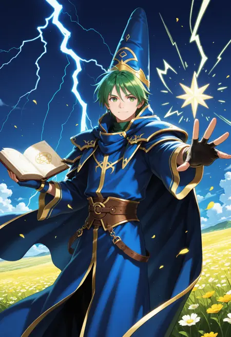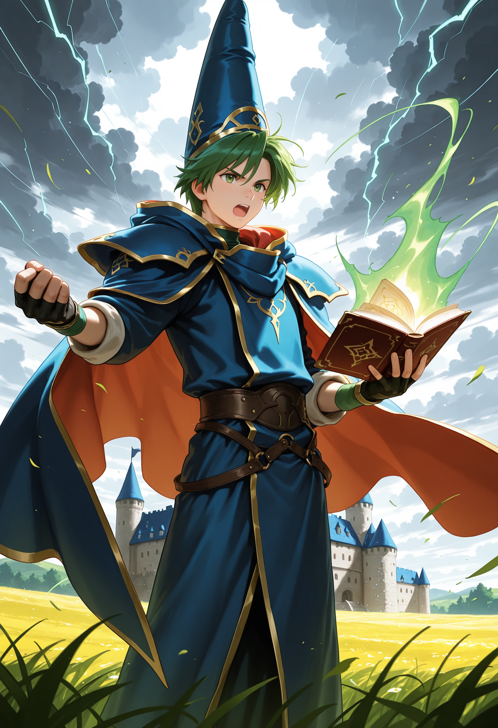 Mage style : merric_(fe), 1boy, green hair, green eyes, fingerless gloves, cape, robe, wizard, wizard hat, aged up