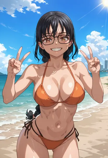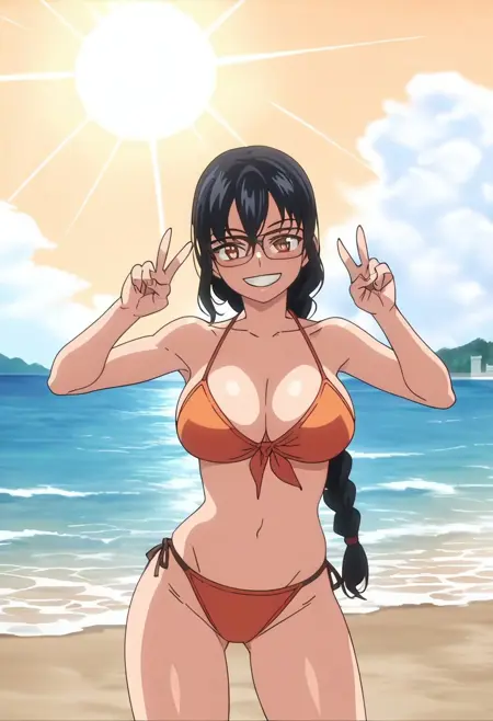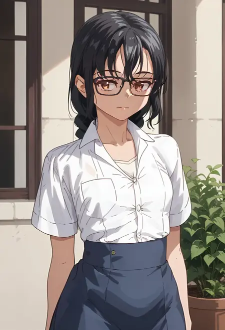 | トレーニングワード | Reiko Kirishima, 1girl, brown eyes, glasses, black-framed eyewear, black hair, long hair, braided ponytail, single braid, braid, コピーしました! white shirt, short sleeves, collared shirt, blue skirt, long skirt, solo, standing, small breastsコピーしました! |