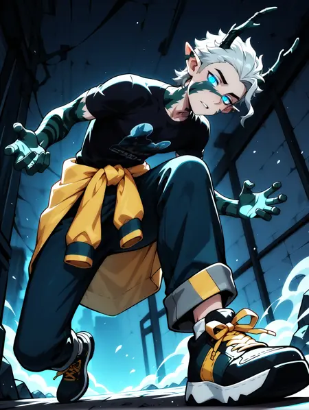Prompts : 1boy, male, pointy ears, horns, short hair, grey hair, blue eyes, glowing eyes, colored skin, antlers, green skin
