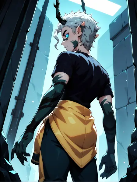 프롬프트: 1boy, male, pointy ears, horns, short hair, grey hair, blue eyes, glowing eyes, colored skin, antlers, green skin