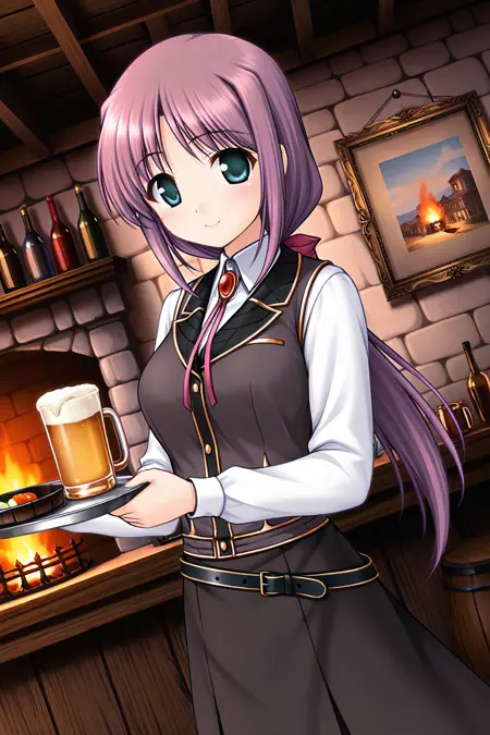 lavria,aqua eyes,green eyes,purple hair,very long hair,parted bangs,hair intakes,sidelocks,low ponytail,hair bow,pink bow,