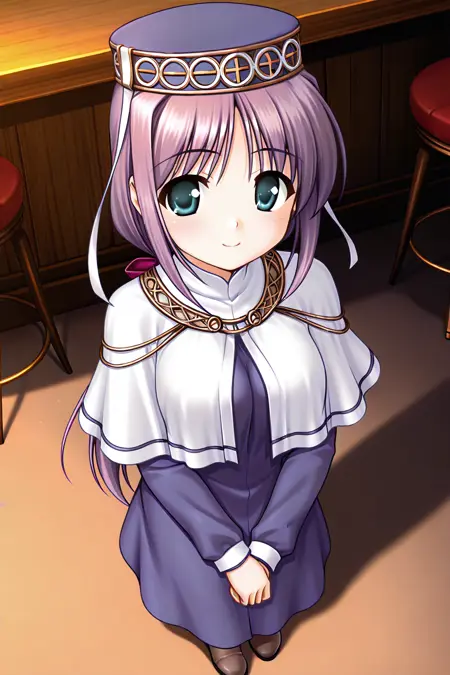 모자, 머리리본, 모자 리본, 흰 리본, 머리장식, 신부, 수녀, 목걸이, 수도복, 흰색 카프, 보라색 드레스, 긴 드레스, 긴 소매, 신발, 부츠, 갈색 신발,