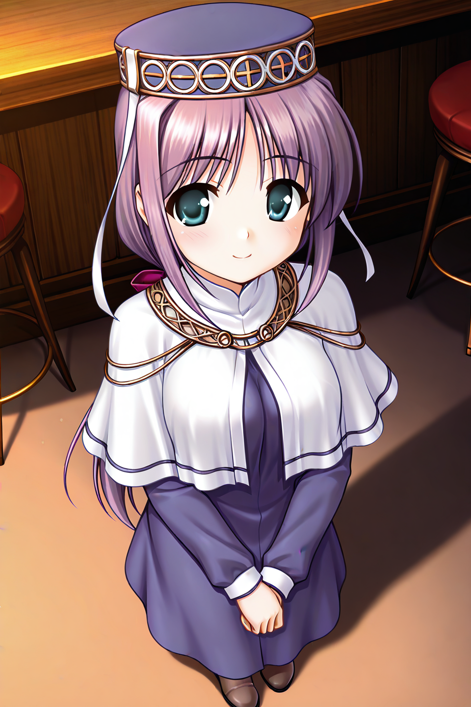 hat,hair bow,hat ribbon,white ribbon,headdress,priest,nun,necklace,habit,white capelet,purple dress,long dress,long sleeves,shoes,boots,brown footwear,