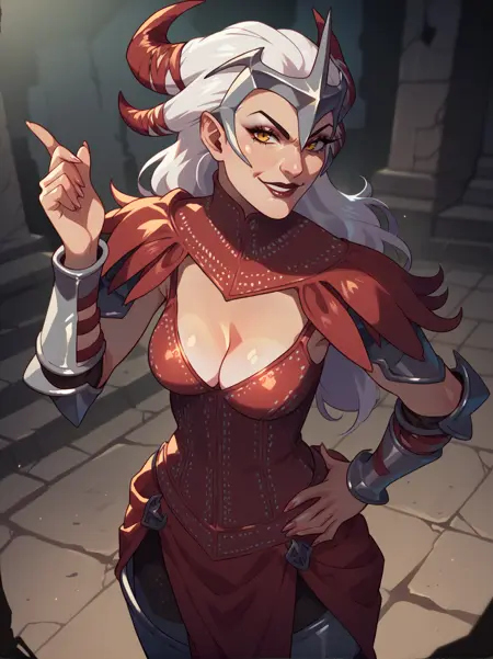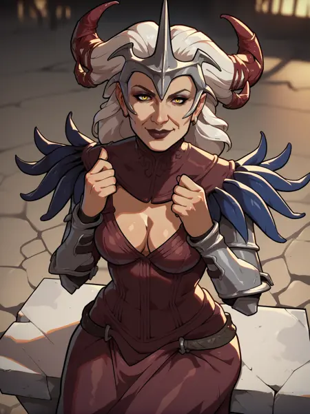 头盔、肩甲、肩部羽毛、连衣裙、束身裙、装甲靴、露胸、高领"使用提示词:"screencap" 以调用原始风格