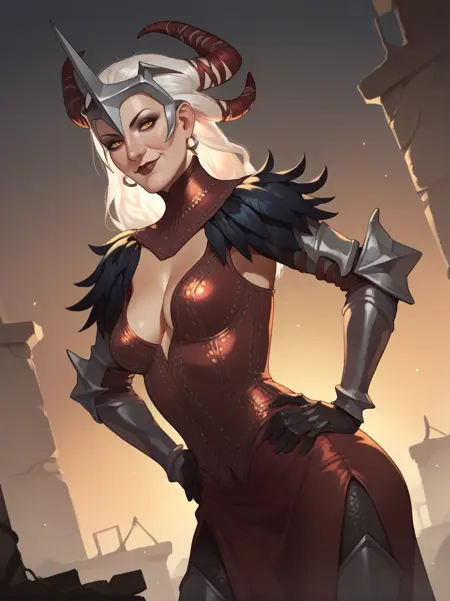 Outfit : "helmet, shoulder armor, feather on shoulder, dress, corset dress, armored boots, cleavage, high collar"