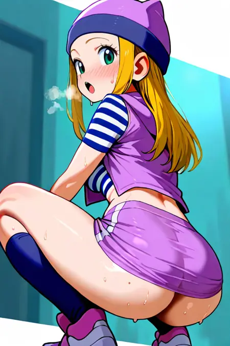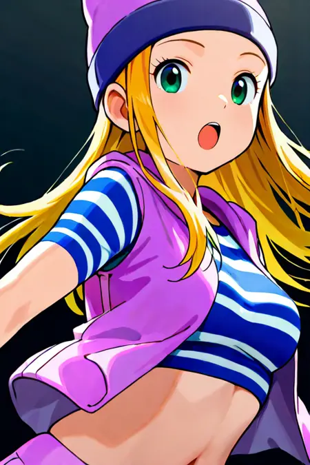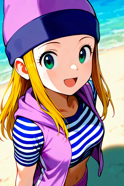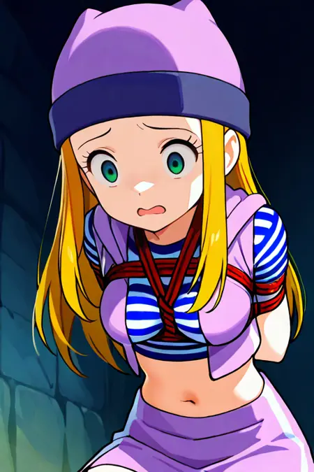 1个女孩,单独,Izumi_Orimoto,长发,金发,绿眼,毛线帽,紫色头饰,