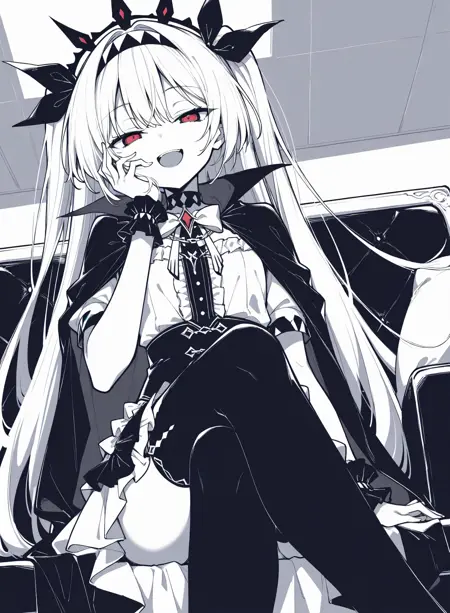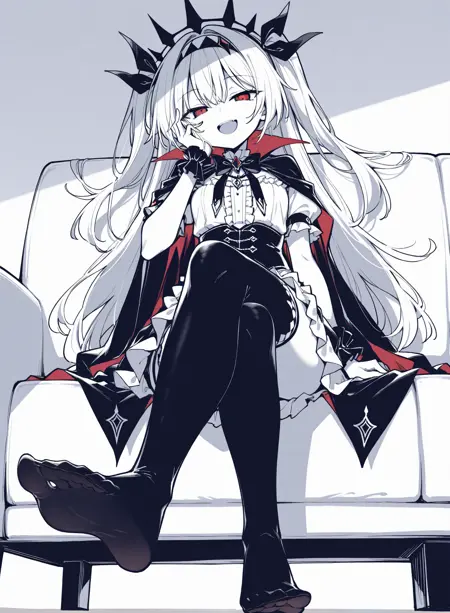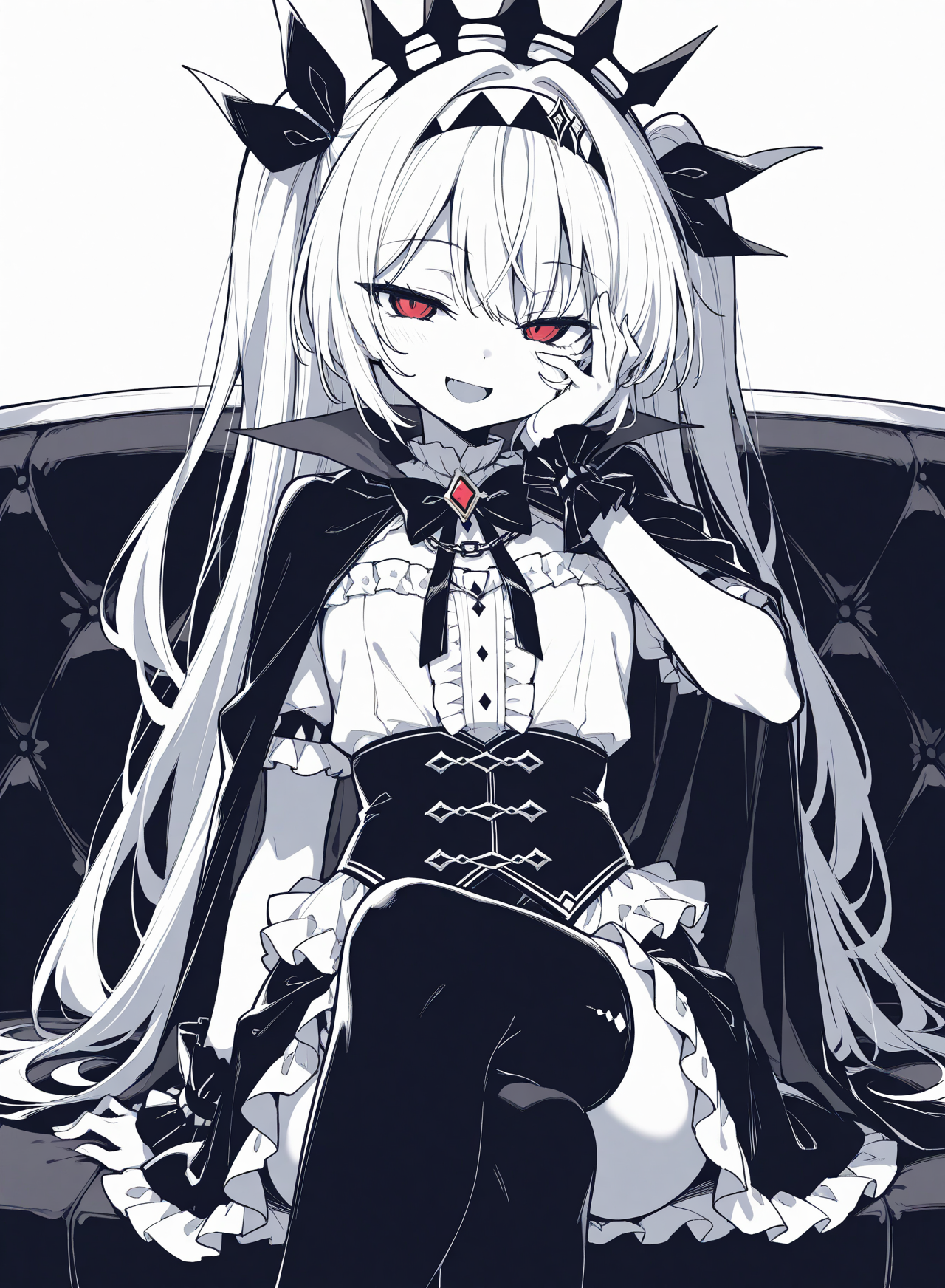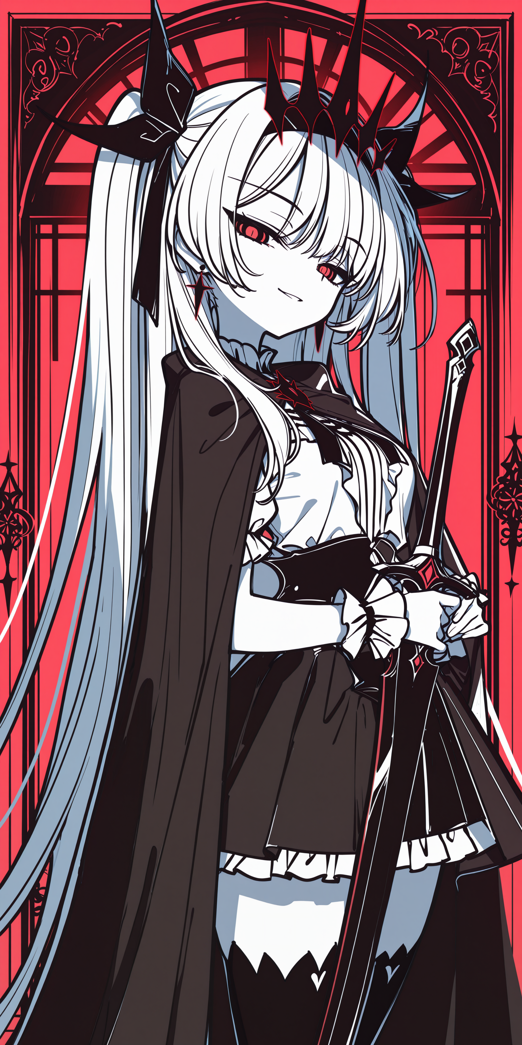 black cape,black crown(Crimson crown outline),Pure black sword(dark red outline),Disembodied Sword,sword at waist,sword at waist,White hair,