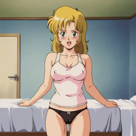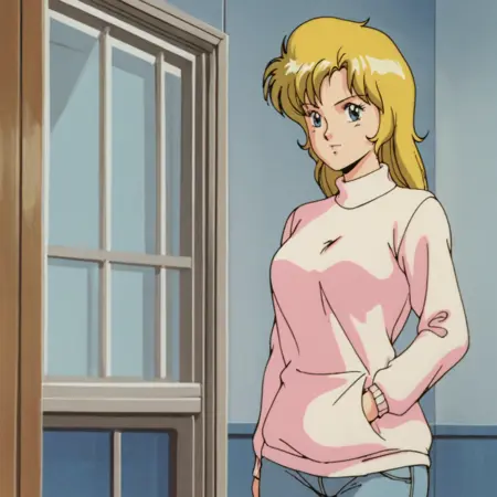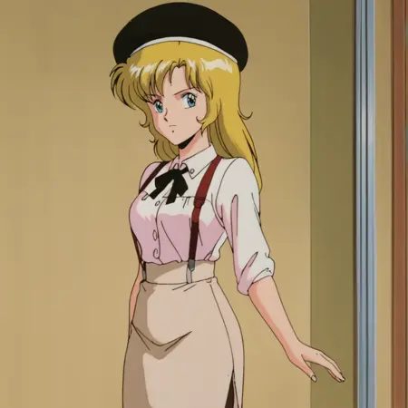不带夹克的触发词:RallyVincentWithoutJacket, 1girl, blonde hair, retro artstyle, blue eyes, necktie, 1980s (style), skirt, long hair, long sleeves, shirt, cowboy shot
