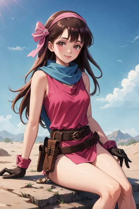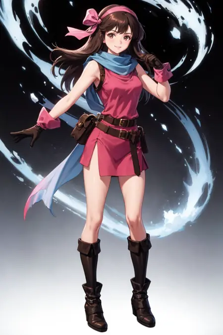 일상 복장은 "핑크 투닉, 헤어밴드, 벨트, 부츠"입니다.