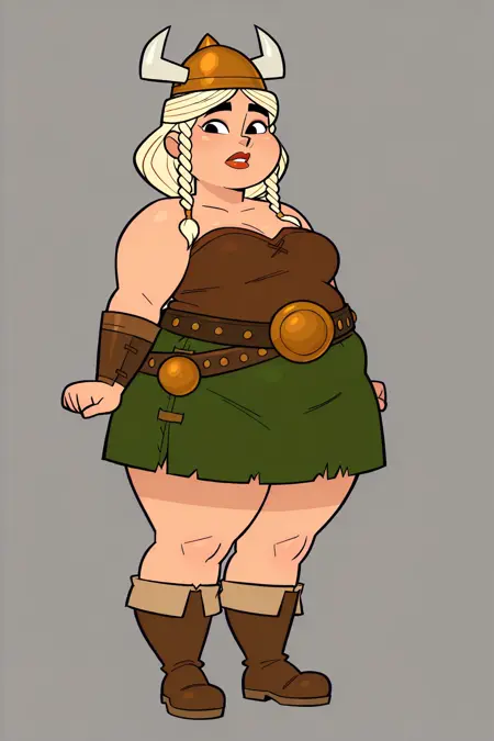 | 训练词汇 | TammyTDRR, 1girl, blonde braided hair, viking helmet with horns, brown top, large belt, green skirt with patchwork details, brown boots with white fur accents, black eyes, red-orange lips, lipstick, fat, chubby, viking outfit, cosplay, tammy (tdi),已复制! |