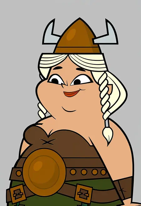 TammyTDRR, 1girl, blonde braided hair, viking helmet with horns, brown top, large belt, green skirt with patchwork details, brown boots with white fur accents, black eyes, red-orange lips, lipstick, fat, chubby, viking outfit, cosplay,