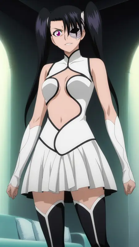 arrancar uniform, white dress, black lining, navel window, breast window, skirt, thighhighs, thigh boots, navel, zettai ryouiki,