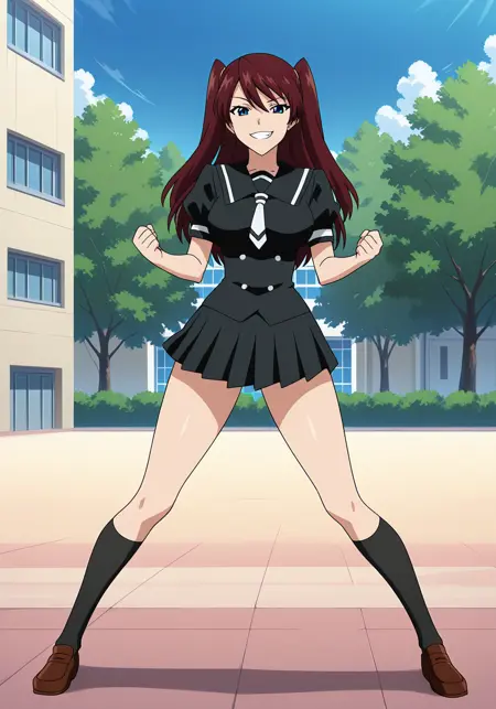 st. aero's school uniform, black shirt, black sailor collar, white necktie, buttons, short sleeves, black pleated skirt, black socks, brown footwear