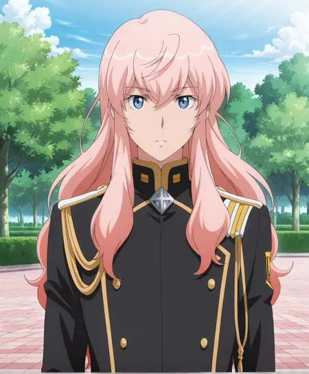 杰作,最佳画质,惊人画质,akoyage,officalblacksuit,单人,长发,粉发,蓝眼睛,天空,男性焦点,公园,1个男孩,制服,白天,动漫上色